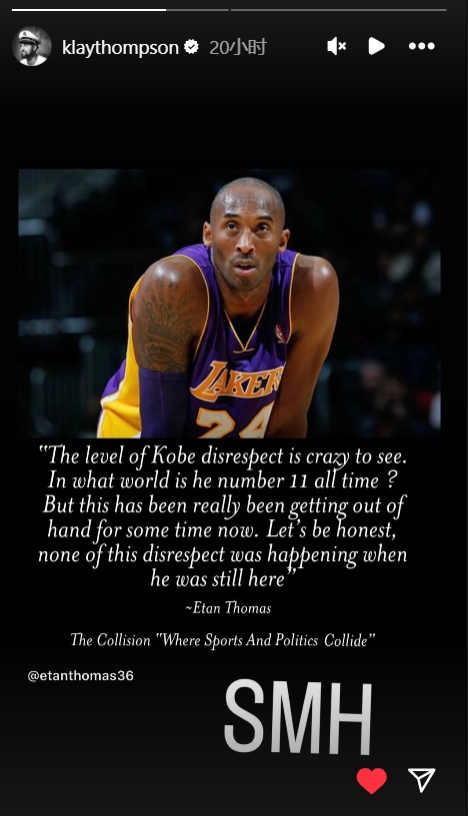 克莱今日就转发言论声援科比近日的媒体待遇:“对科比的不敬已经到了疯狂的程度。在哪个平行宇宙他会掉到第11位?但现在这种事情已经失控了,我们老实讲,如果科比还活着,这些对他不敬的事情根本不可能发生!”